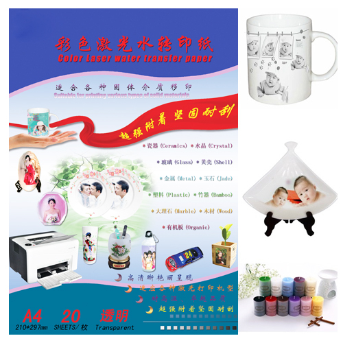 The laser waterslide decal paper is water transfer decal paper for laser printer. Compared with inkjet decal paper, clear decal paper is free film waterslide decal paper. Laserjet waterslide paper does not need spray acrylic aerosol paint (varnish). In addition, the laser clear waterslide decal paper is different from white waterslide paper. It is for clear / transparent background. Laserjet waterslide decal paper clear is suitable for white, transparent or light-color surface, such as glass, ceramics, mugs, plastic models, candles, crystal, marble, metal, etc. For crystal and glass, it can show a transparent effect after transfer. At the same time, for white and light-colored objects, it can display the background and shading of the object itself.