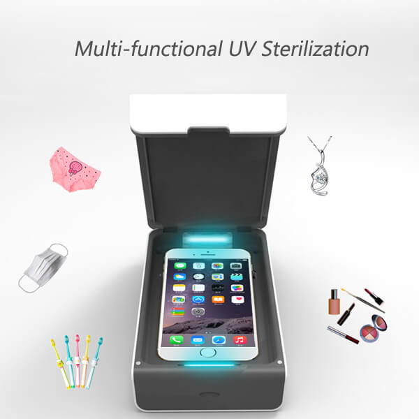 1. 1. Multifunction: it is cell phone sanitizer and charger. This phone disinfector can charge iphone or all other smartphones. Moreover, it is also a aroma diffuser. You can drop the aroma into the sponge tank of the case. Further, you can use it as phone holder. In addition, you can also disinfect the many other items, such as toothbrushes, masks, ladies/baby underwear, jewelry, makeup tools, watches, coins, etc. You can use this ultraviolet UV sterilization box to sterilize your masks.